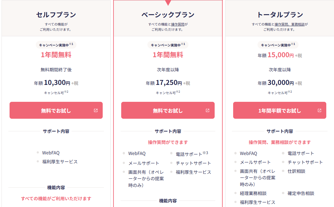 ・「操作質問しなくてもOK」「業務相談しなくてもOK」な人はセルフプランでいいのかなと思いますが、確定申告の相談、仕分け相談とかしないと不安な方は初年度無料だしトータルプランがおすすめです。